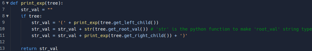 If we perform a simple inorder traversal of a parse tree we get our original expression back, without any parentheses. Going back to the parse tree code we can test this by making slight modifications.