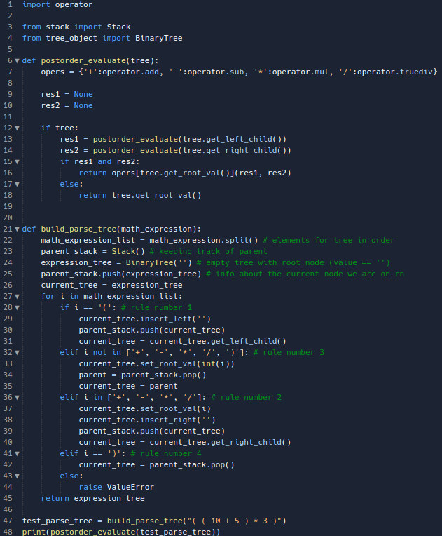 Along with the Stack and BinaryTree operations, the code for our parse tree builder is presented below.