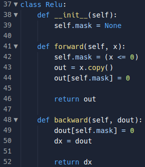 The mask instance saves the trouble of implementing an if-statement for converting variables less than 0 into 0. Since ReLU only has outputs of either 0 or 1 we use the mask function to separate the 0’s and 1’s.