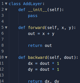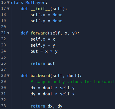 The backward propagation for multiplication nodes require a swapped value multiplication of the forward inputs. Since the backward inputs rely on the forward inputs, we will save the forward inputs for the backward function.