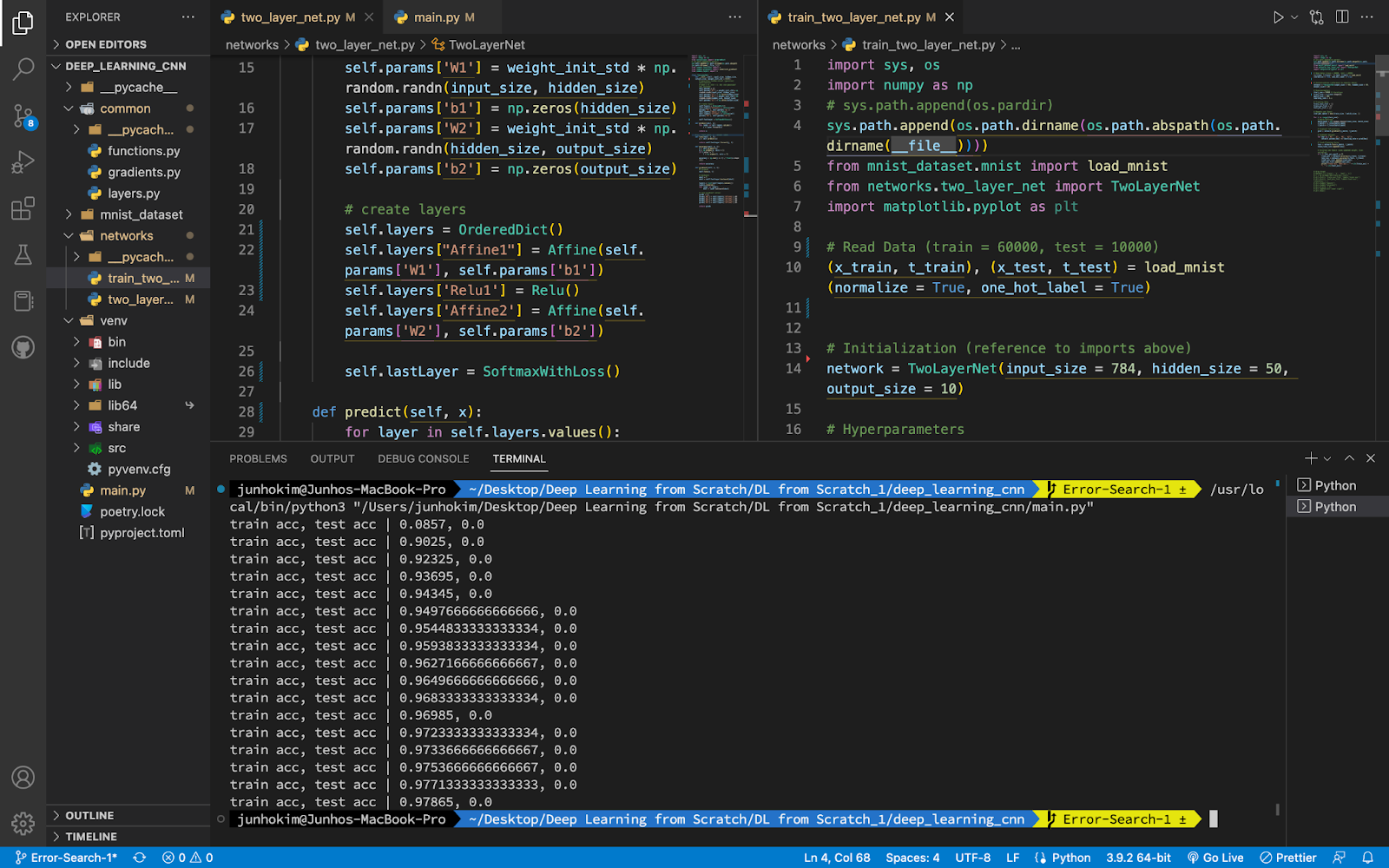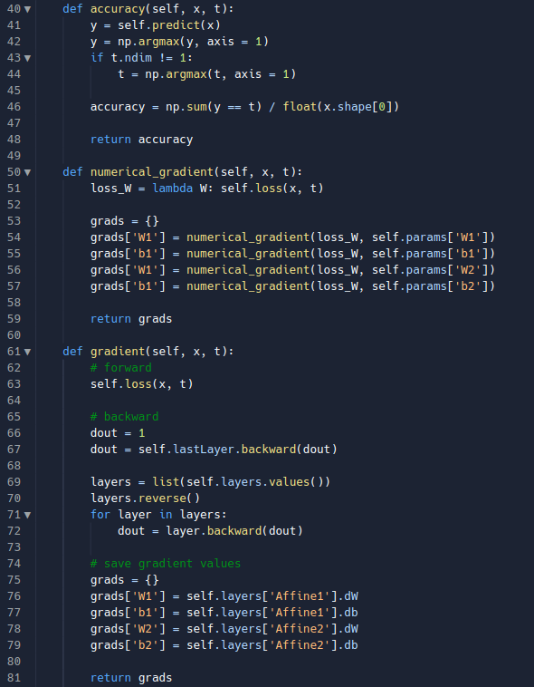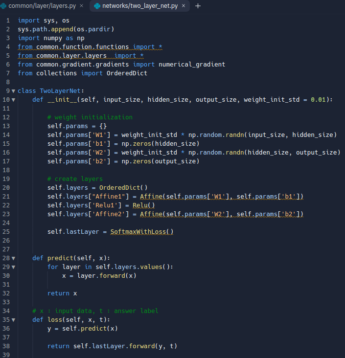 In the previous post, we programmed forward and backward propagations for each layer (Affine, ReLU, Sigmoid, Softmax) as separate classes. Now we only need to import and build the CNN.