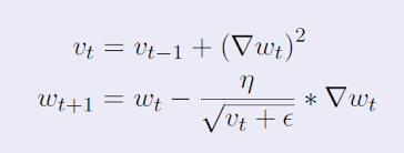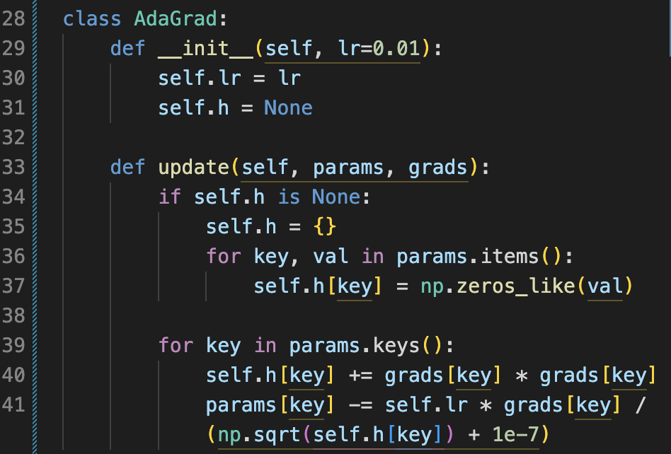 It’s interesting how the new adaptive learning rate is part of the numerator. The h variable from line 1 measures the gradient descent for each variable. The greater the gradient, the more the learning rate decays.