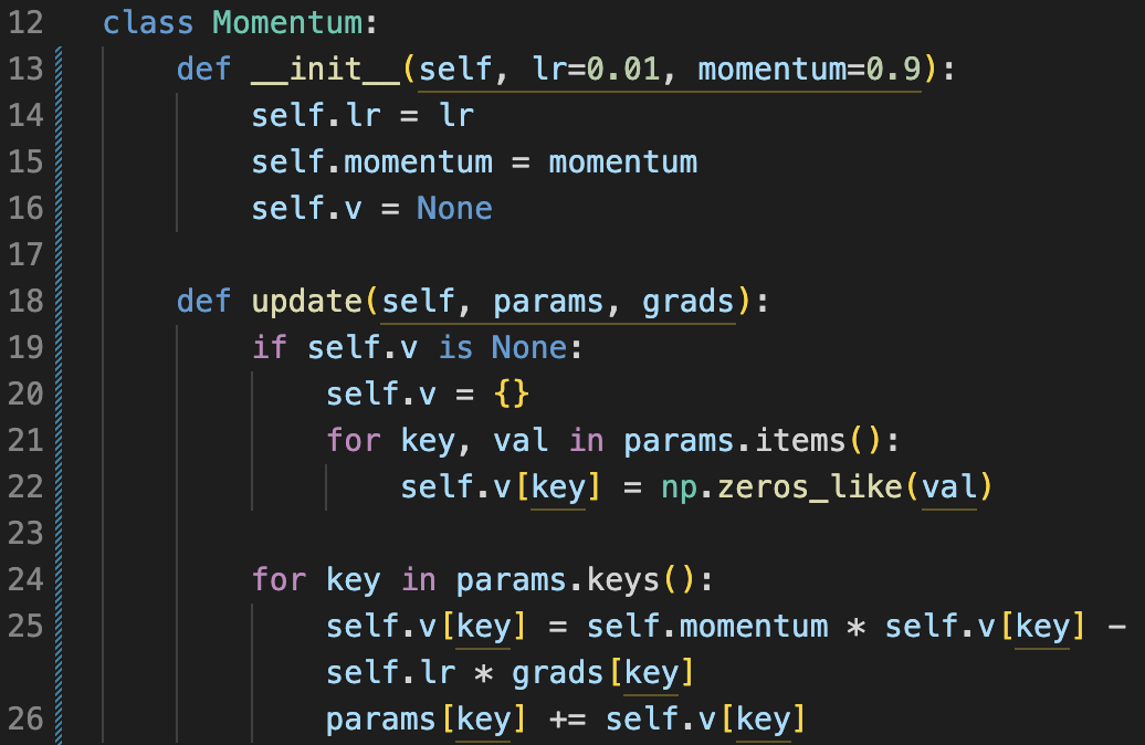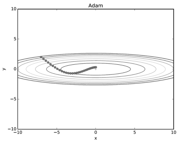 Compared to SGD, the momentum method has a smoother curvature heading towards the minimum point. The velocity variable pulls the x variable faster. Similar to a ball falling towards the bottom, the x-axis follows along a relatively fixed path (straight line), thus the velocity factor adds speed (greater descent) compared to y.