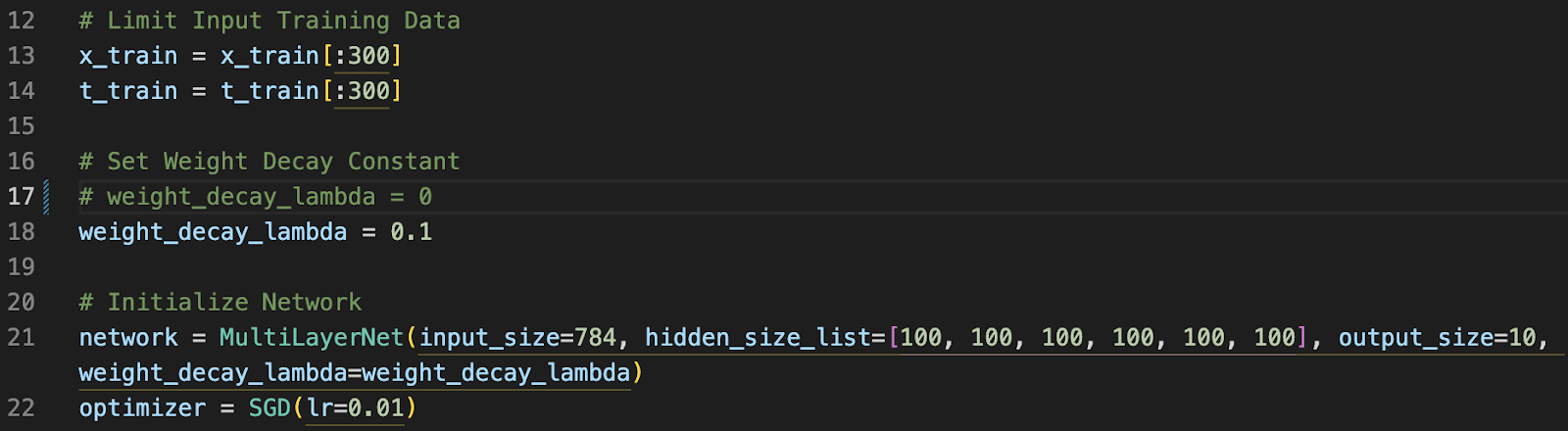 Overfitting refers to a network that has adapted to a specific data set. This prevents the network’s performance on unprecedented data. To prevent this we are going to implement weight decay and dropouts.