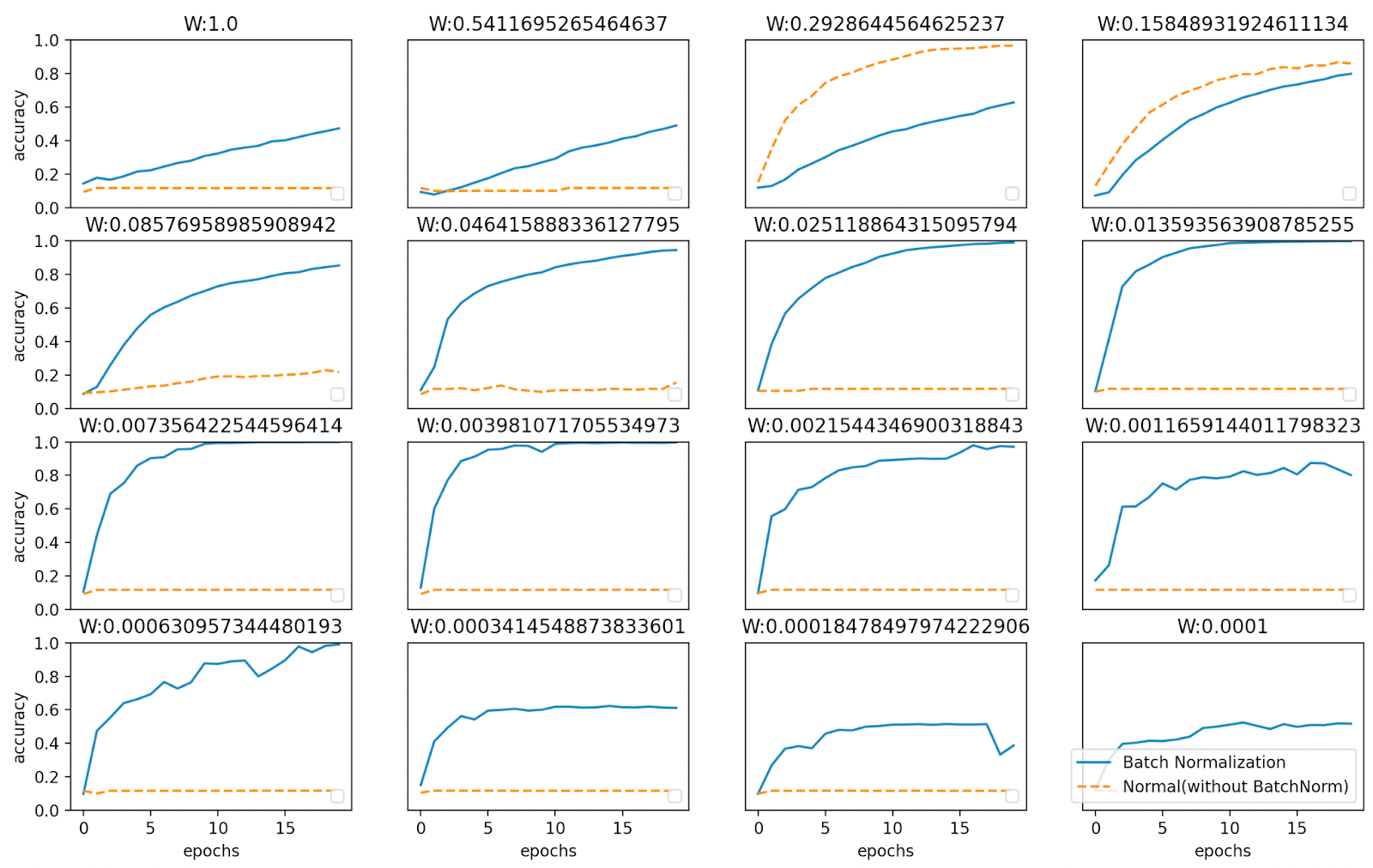 The W above each graph is the std of initial weight inputs. The outcome of multiple scenarios show that the initial weight distribution highly affects the learning curve. However, despite the different weight initializations, you can see that batch normalization still returns stable learning curvatures. You can find the code on my github page.