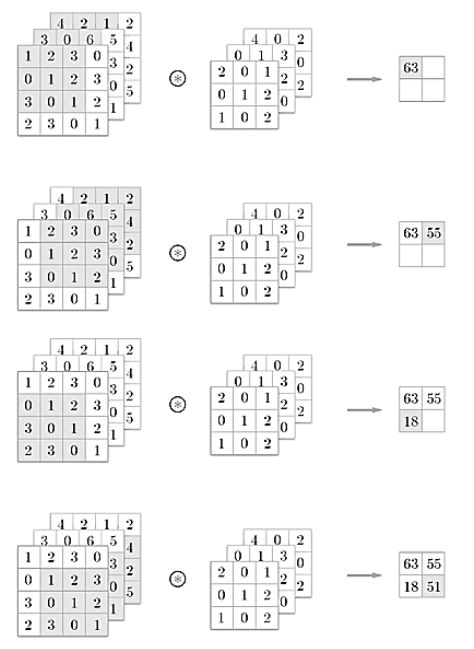 The input data of the convolutional layer is fused multiply-add (FMA). The process uses filters, which are called kernels, and these move around the image as you see above. The gray areas where the kernel overlaps with the input data are called windows.